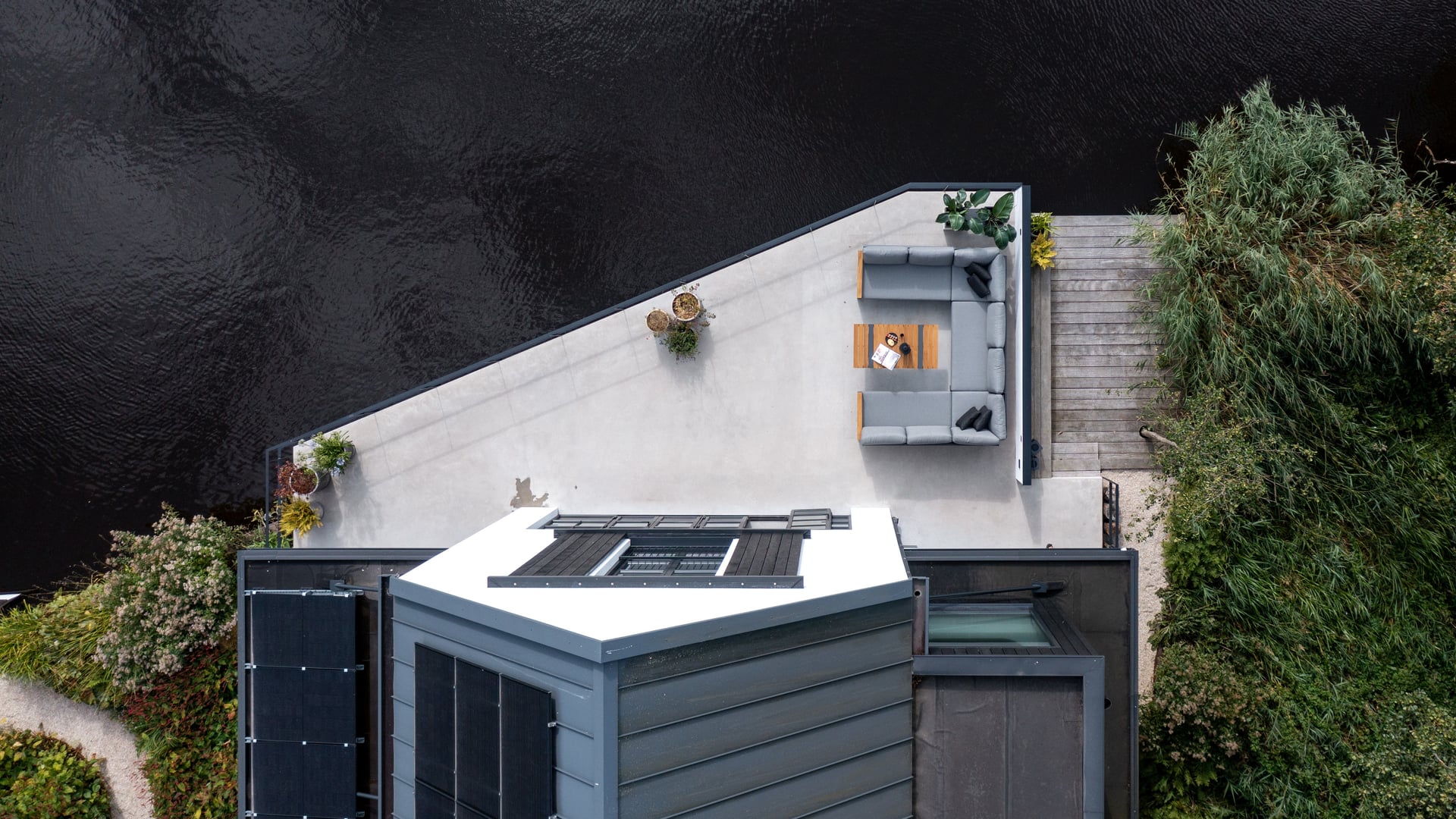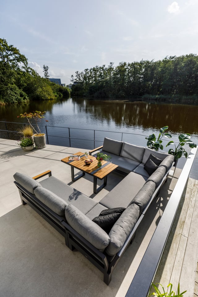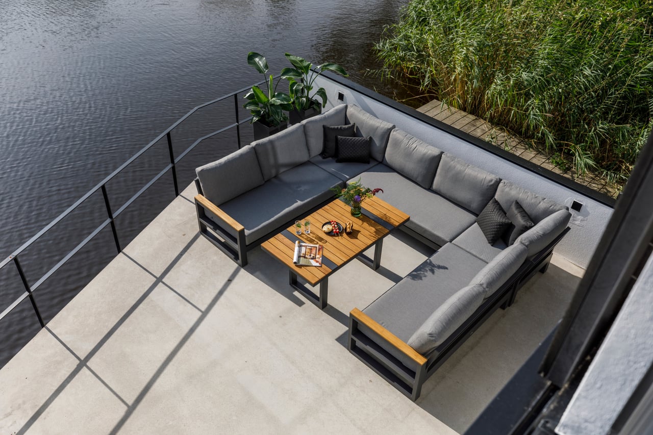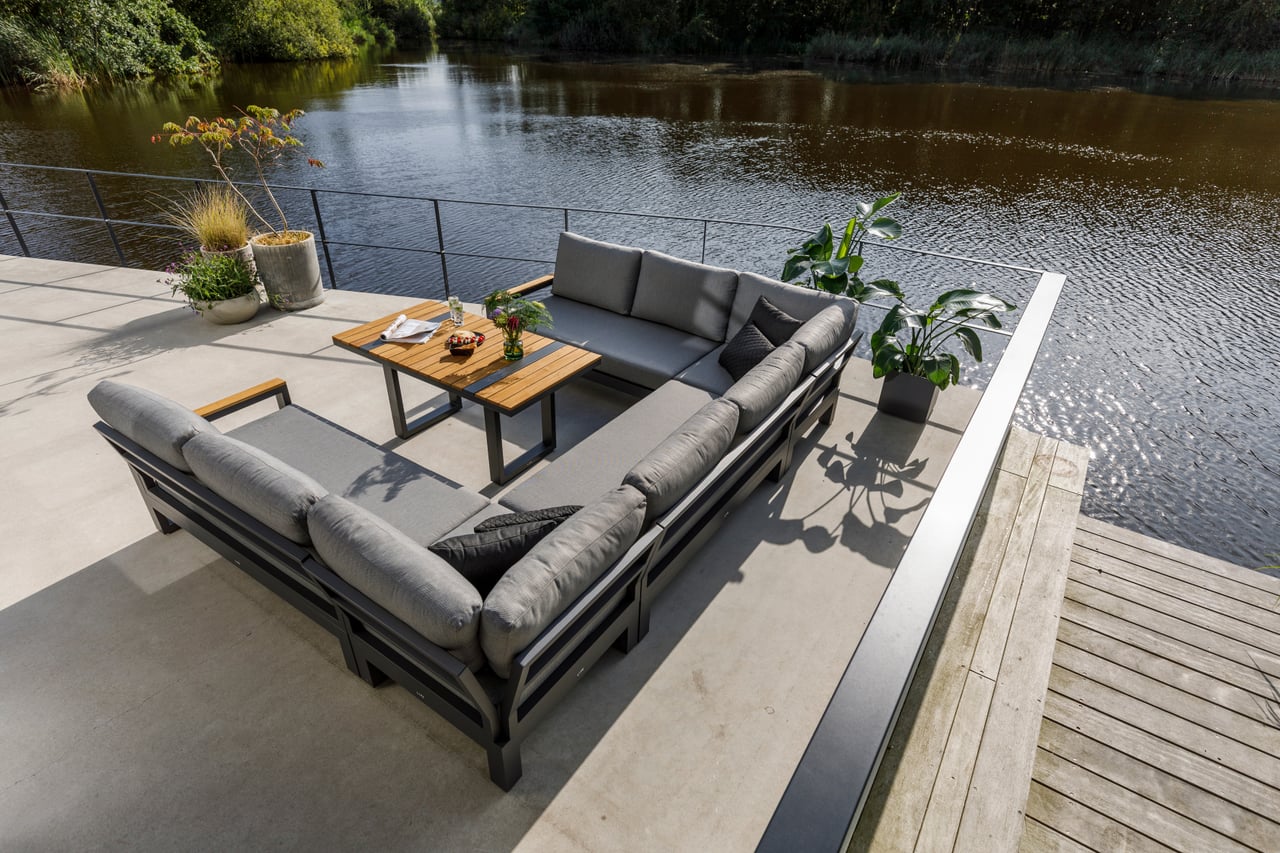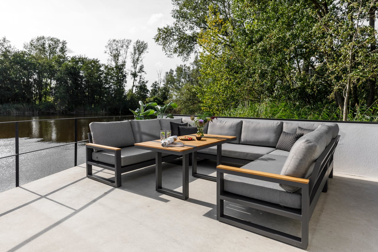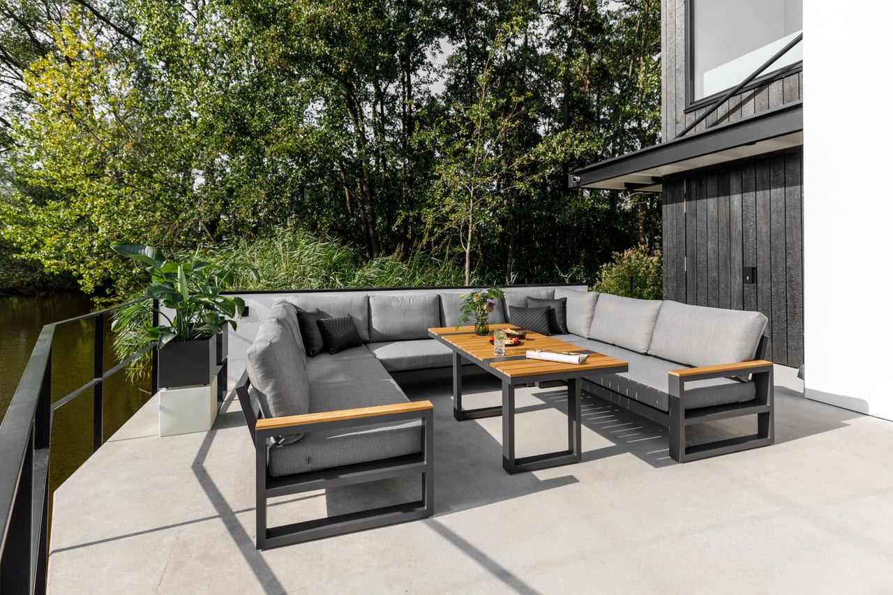 Konstrukcja mebli wykonana została z trwałego aluminium w kolorze lava (grafitowym), które jest odporne na korozję, wilgoć i zmienne warunki atmosferyczne. Prosta, geometryczna forma podkreśla nowoczesny charakter zestawu, a jednocześnie pozostaje ponadczasowa i łatwa do aranżacji w różnych przestrzeniach.