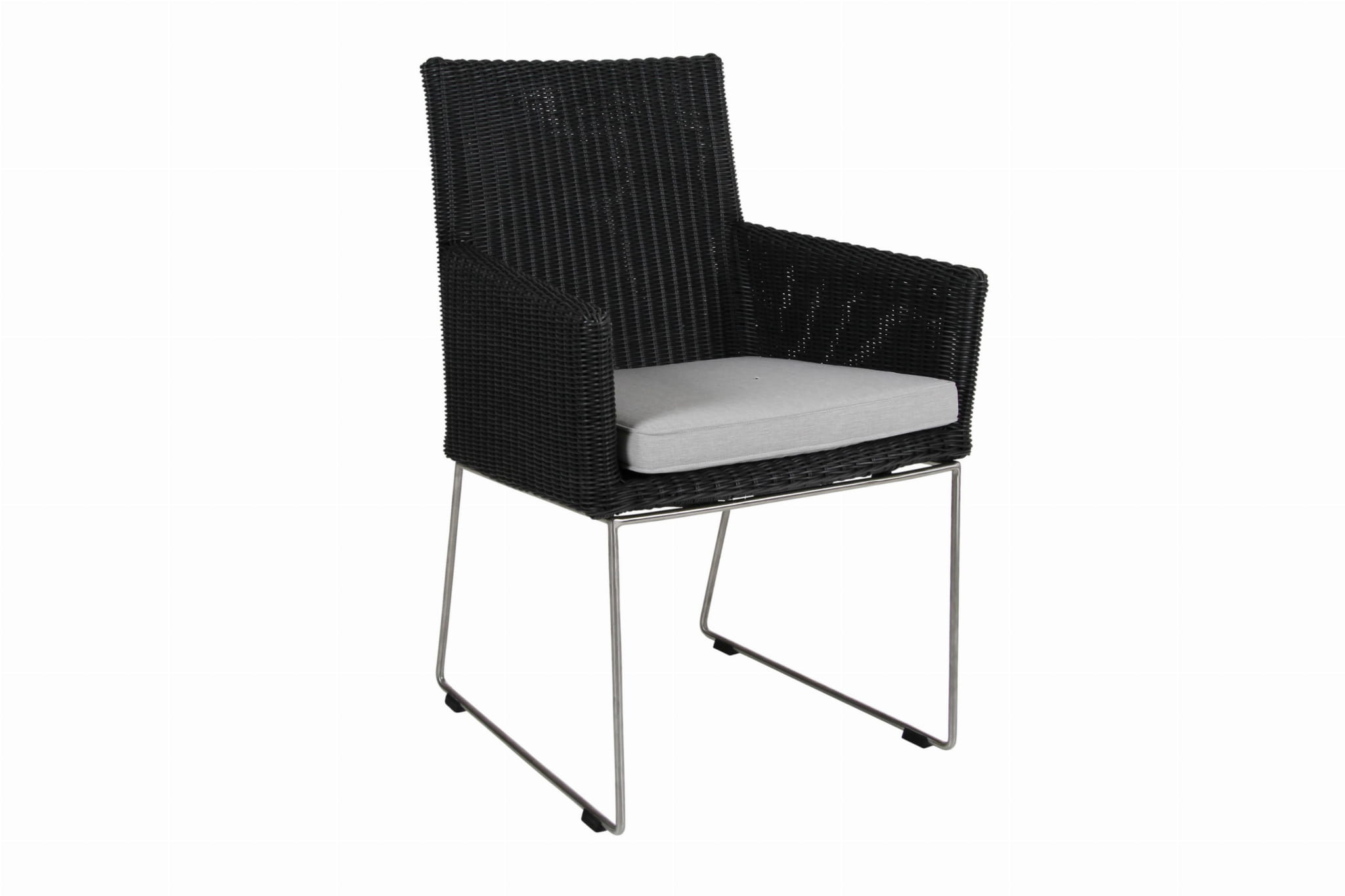 Krzesło technorattan na płozach posiada głębokie siedzisko i wysokie oparcie z podłokietnikami, dzięki czemu zapewnia wysoki komfort podczas siedzenia. Mebel uzupełnia poduszka, która jest wykonana z materiału odpornego na ekspozycję na promieniowanie UV i kontakt z wilgocią.