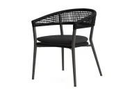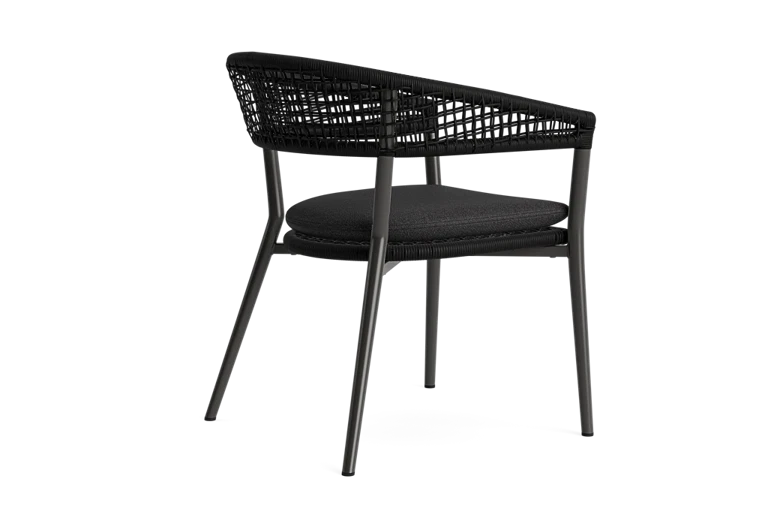 Konstrukcja wykonana jest z lekkiego, a jednocześnie wytrzymałego aluminium, które zapewnia odporność na warunki atmosferyczne i długą żywotność. Charakterystycznym elementem jest oparcie wykonane w technice twisted loom – to nowoczesne plecenie z syntetycznych włókien, które nadaje mu naturalny wygląd, a jednocześnie gwarantuje trwałość i odporność na pogodę. Oparcie wyróżnia się ciekawą fakturą i delikatnie rzemieślniczym stylem, zapewniając przy tym wygodne podparcie dla pleców.