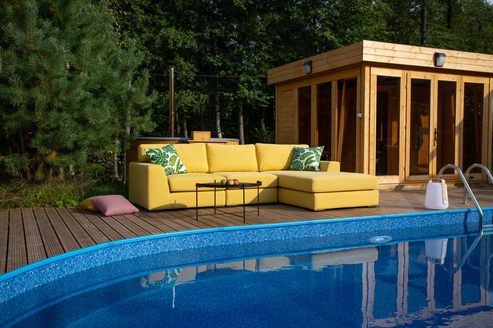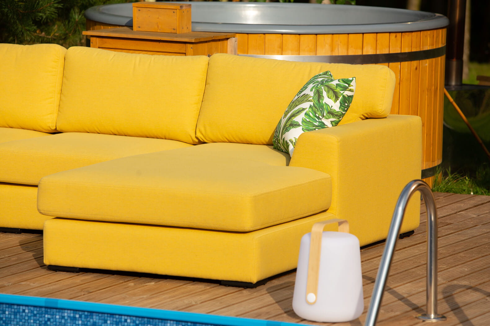 Narożnik o wymiarach 280x184 cm zapewnia wystarczającą przestrzeń dla kilku osób do komfortowego relaksu. Żółty kolor dodaje energii i radości, nadając przyjemną atmosferę w otoczeniu ogrodu.
