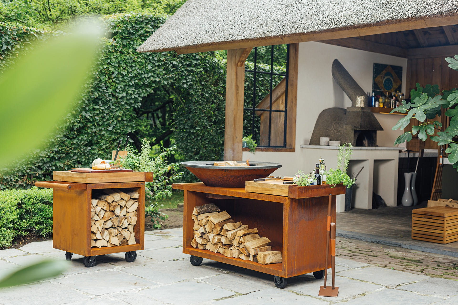 Stół OFYR Mise en Place Corten 65 PRO zapewnia odpowiednio dużą przestrzeń do gotowania poza domem. Wyróżnia się nieprzeciętną estetyką i urokiem, dzięki którym natychmiast przyciąga spojrzenia. Mebel pasuje do aranżacji w różnych stylach i znakomicie prezentuje się na tle zieleni ogrodu.