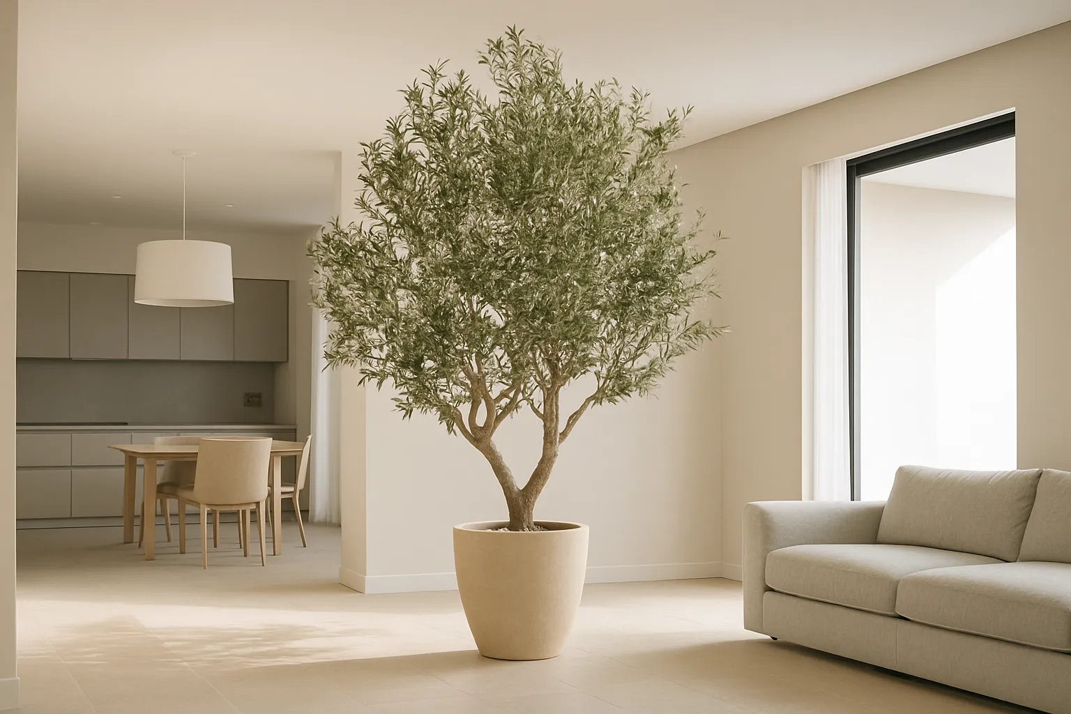 Sztuczne drzewko oliwne 250 cm to imponująca dekoracja, która natychmiast przyciąga uwagę swoją naturalną formą i śródziemnomorskim charakterem. Wysoka, smukła sylwetka, realistyczny pień oraz delikatne, oliwkowozielone liście z subtelnymi owocami sprawiają, że roślina wygląda niezwykle autentycznie.