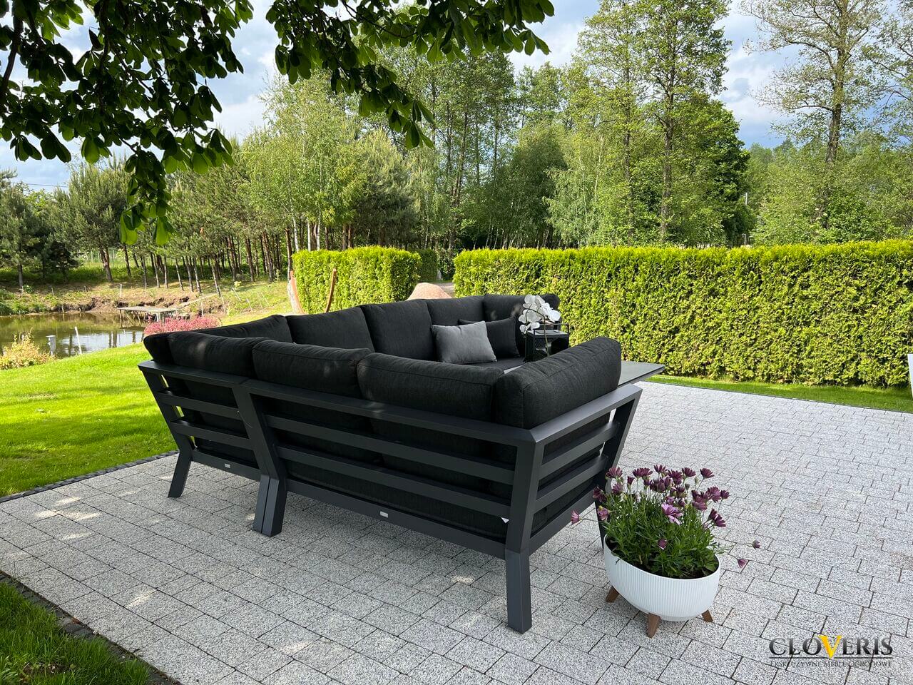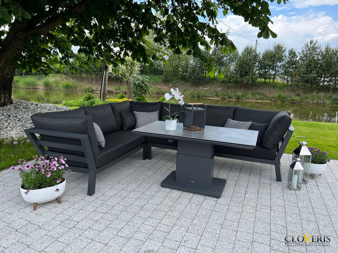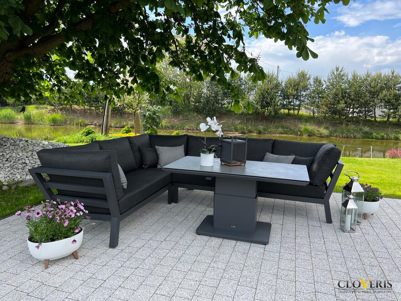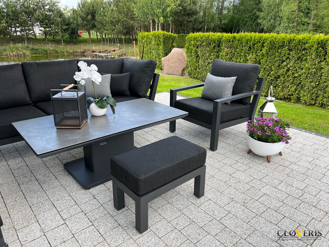 Meble wchodzące w skład zestawu zostały wykonane z profili aluminiowych pomalowanych na grafitowo. Całość dopełniają wytrzymałe, grube poduchy na siedziska i oparcia. Meble są trwałe i odporne na zmieniające się warunki atmosferyczne.