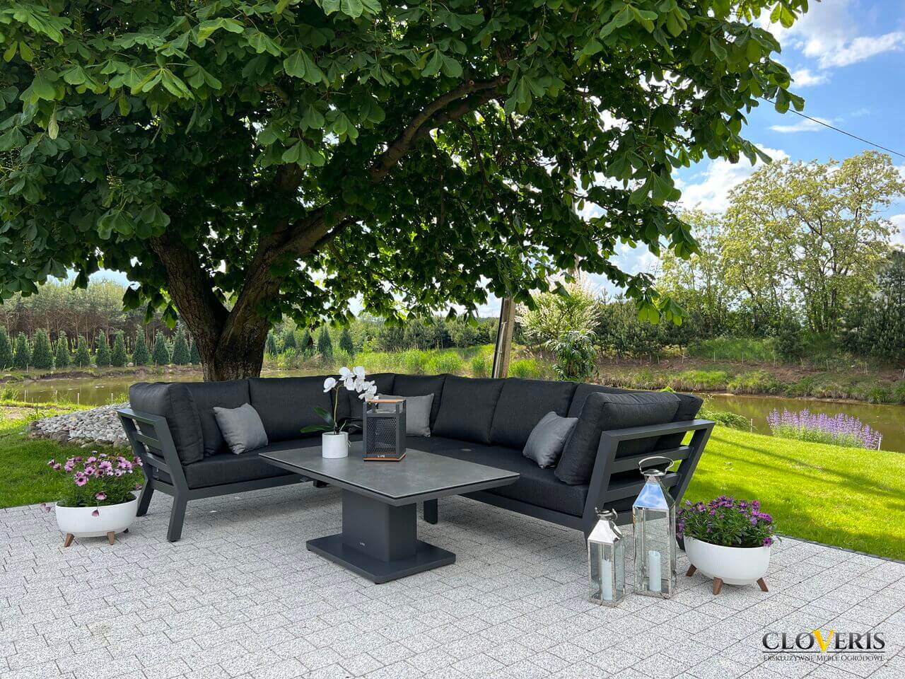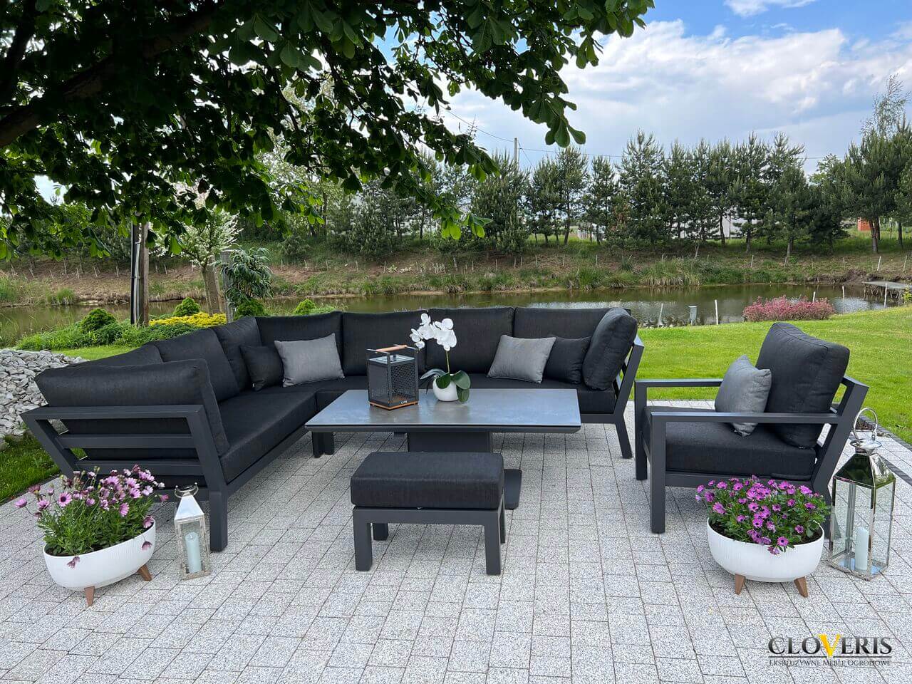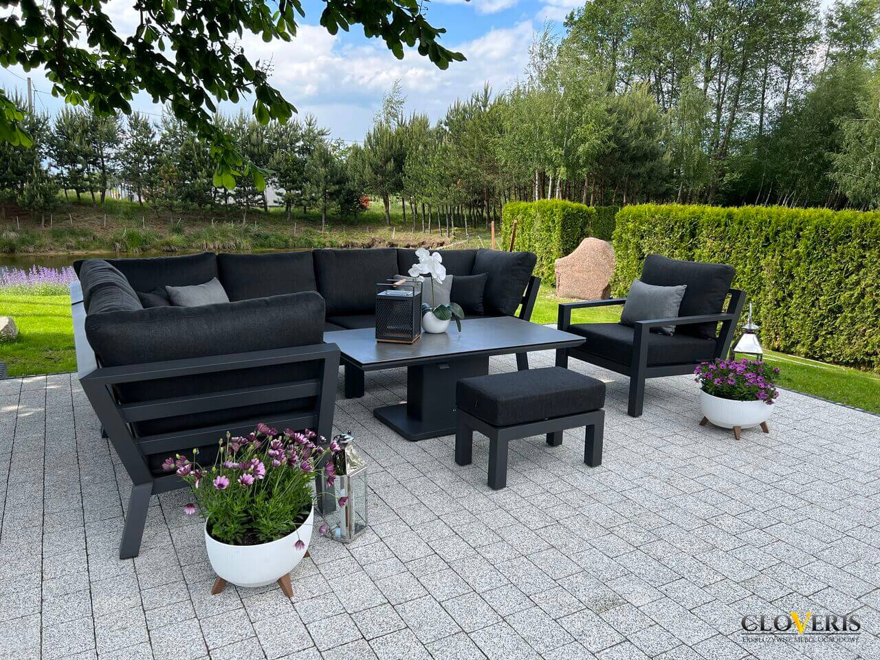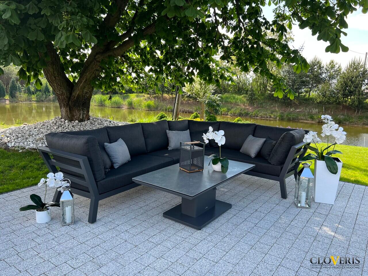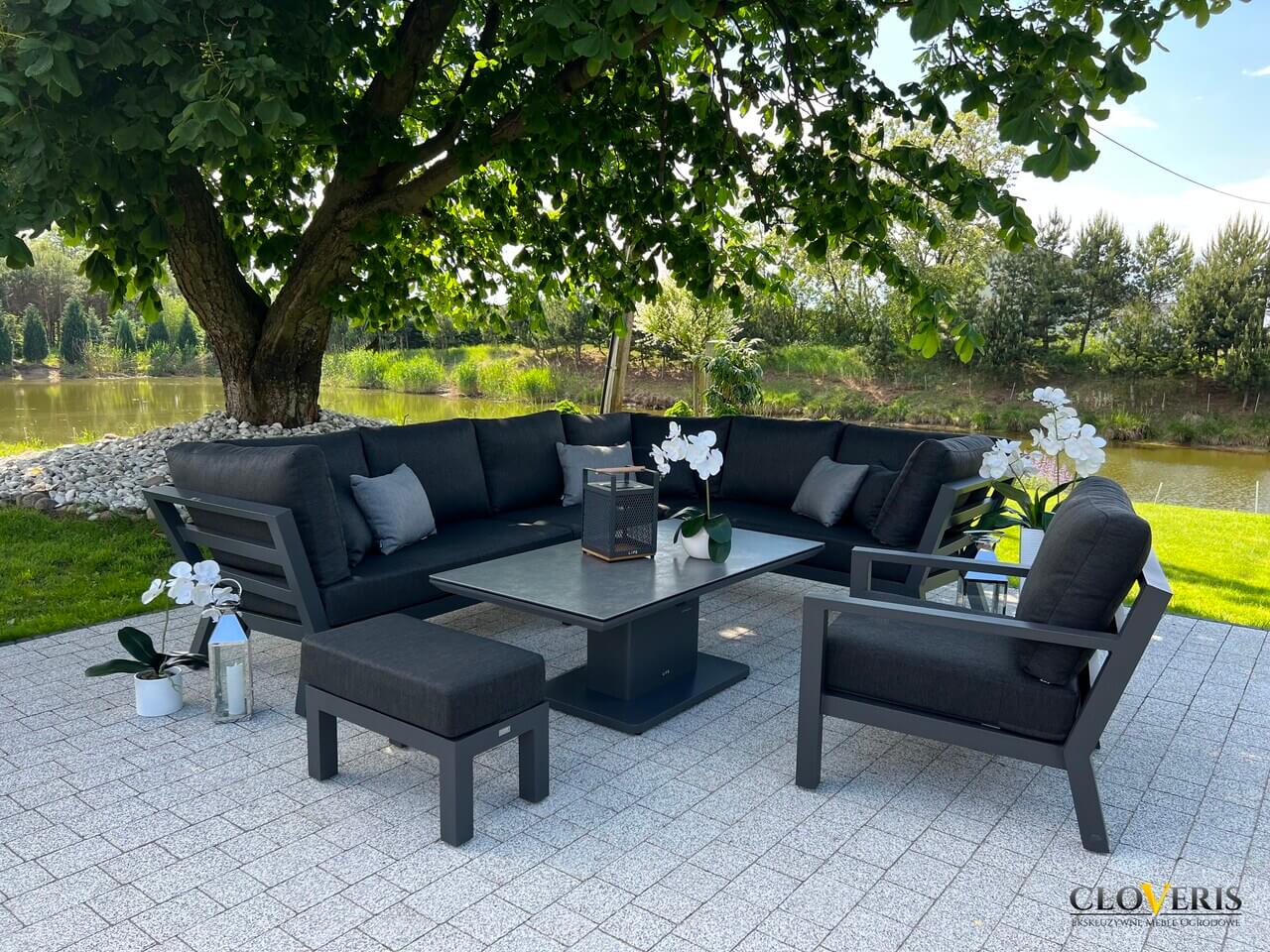 Meble wchodzące w skład zestawu zostały wykonane z profili aluminiowych pomalowanych na grafitowo. Całość dopełniają wytrzymałe, grube poduchy na siedziska i oparcia. Meble są trwałe i odporne na zmieniające się warunki atmosferyczne.