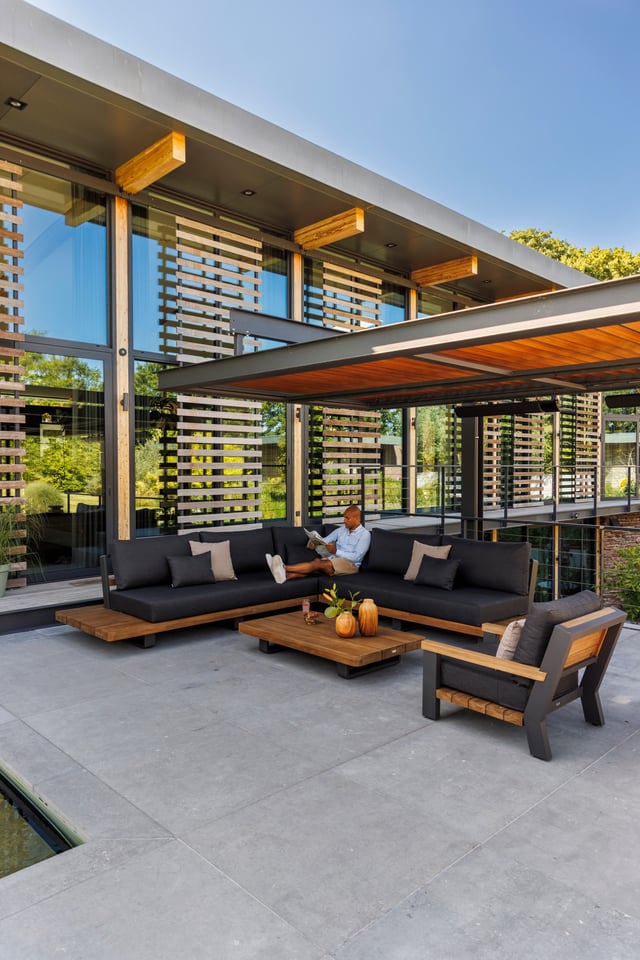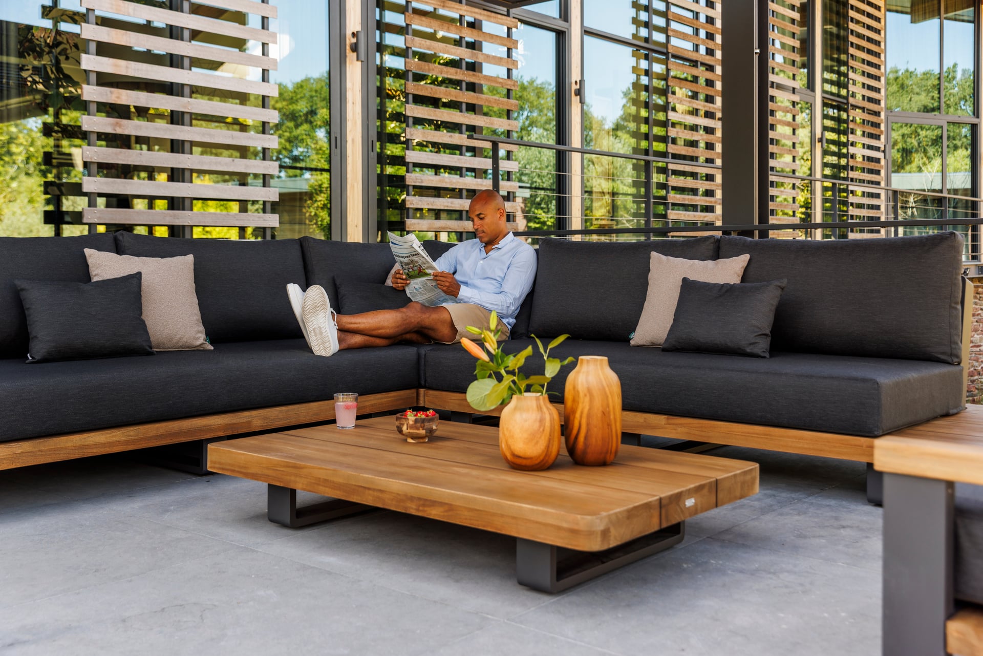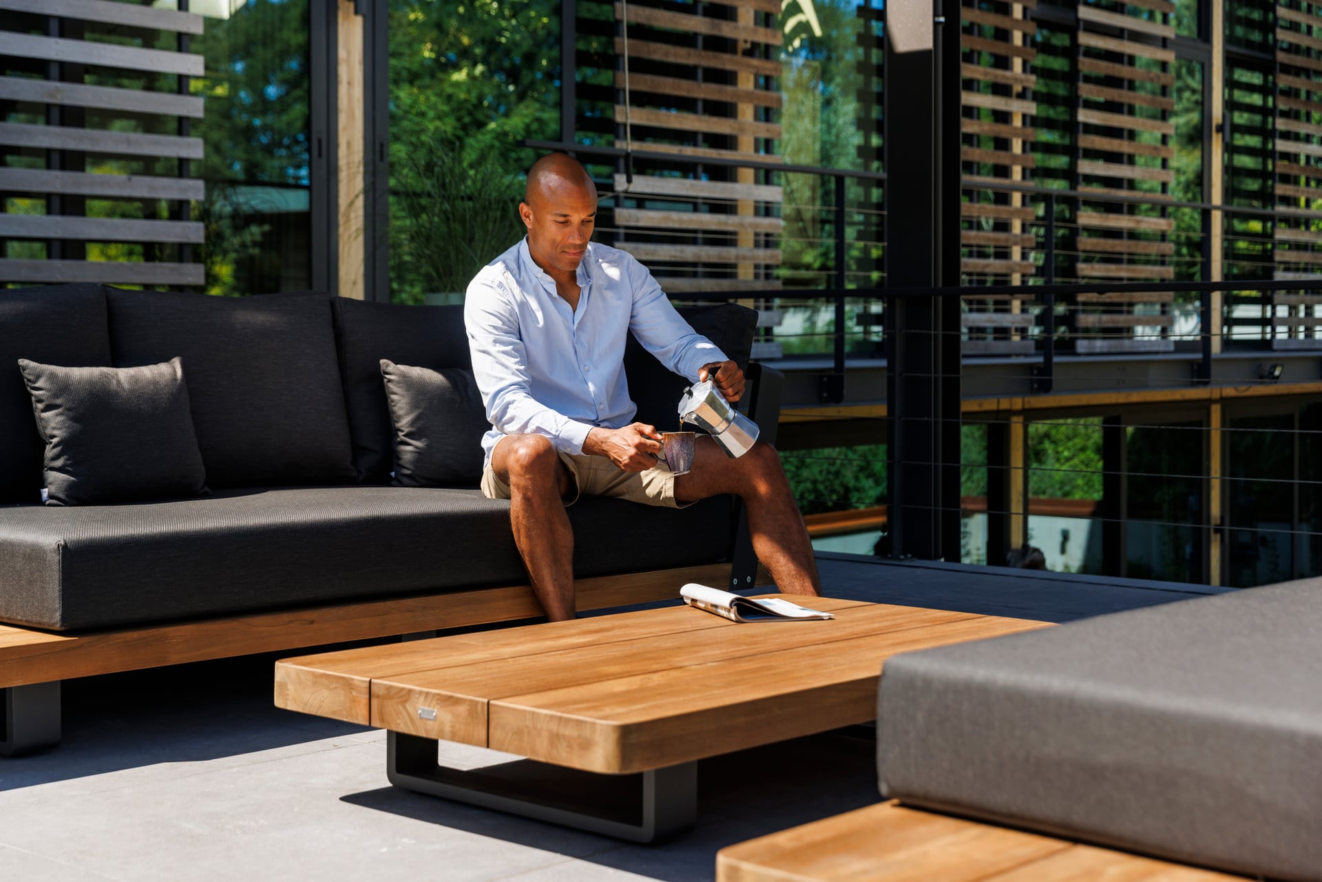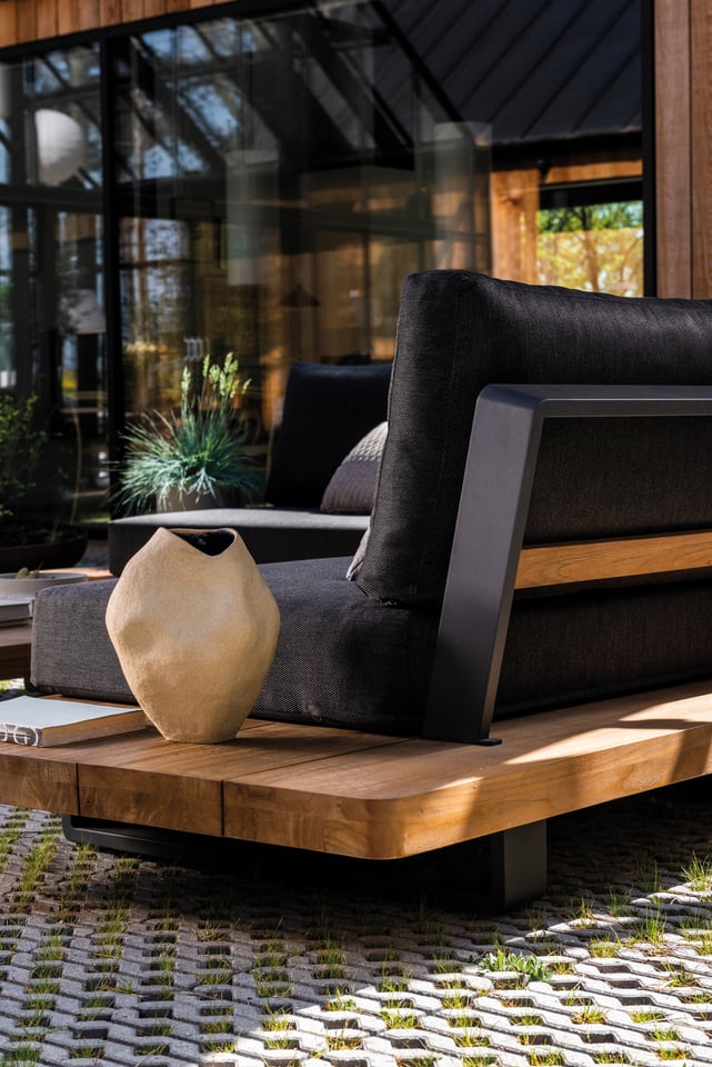 Konstrukcja mebli opiera się na szlachetnym drewnie teakowym, znanym z wyjątkowej trwałości i naturalnego piękna, zestawionym z aluminiową ramą w kolorze Lava. To harmonijne zestawienie ciepła drewna z nowoczesnym charakterem metalu nadaje kolekcji unikalny styl, który podkreśli prestiż każdej przestrzeni wypoczynkowej.
