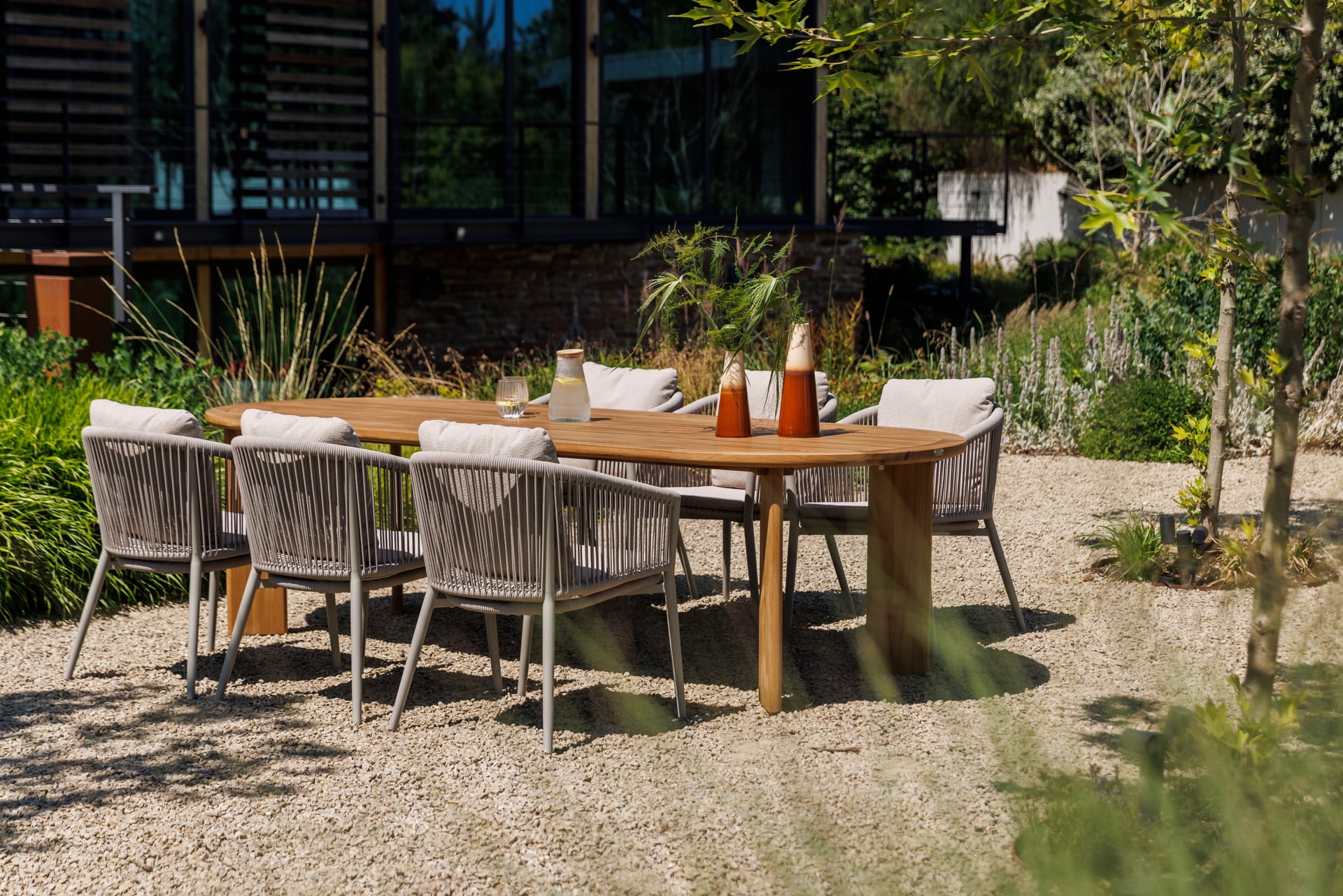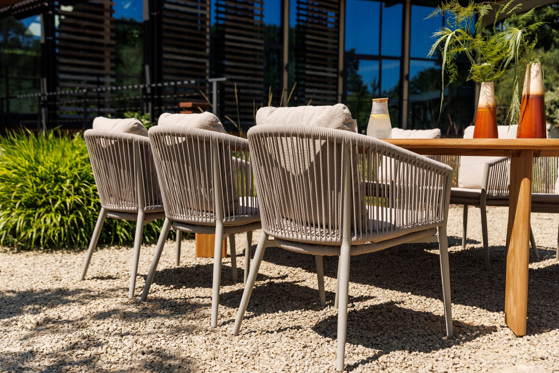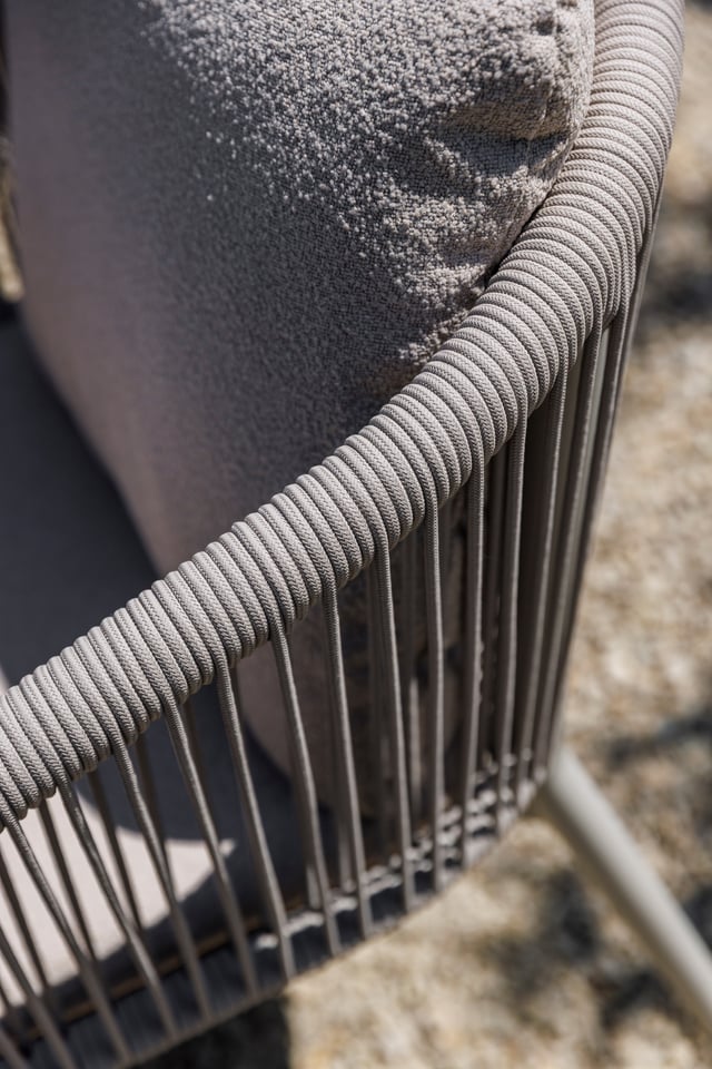 W skład zestawu wchodzi 6 beżowych krzeseł aluminiowych, które łączą lekką, a zarazem solidną konstrukcję z designerskimi oparciami wykonanymi z lin. Takie połączenie materiałów nadaje krzesłom nowoczesny charakter, jednocześnie wprowadzając wizualną lekkość. Komfort użytkowania zapewniają beżowe poduszki, które podkreślają ciepły i harmonijny styl zestawu.