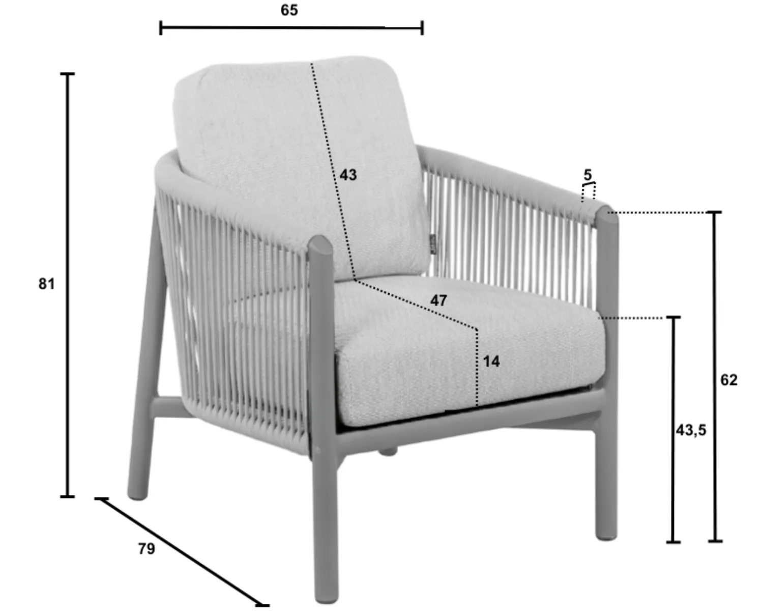 Konstrukcja zestawu wykonana jest z aluminium w kolorze taupe, zapewniającego trwałość, odporność na warunki atmosferyczne oraz spójną, stonowaną estetykę. Wersja Low została wyposażona w wygodniejsze, głębsze fotele obiadowe, które oferują bardziej odprężającą pozycję siedzenia. Fotele posiadają jasnobeżowe poduszki outdoorowe, miękkie i odporne na użytkowanie zewnętrzne, a ich oparcia wykończone są nowoczesną plecionką z liny, podkreślającą lekkość i współczesny charakter kolekcji.
