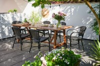 Wszystkie z mebli tworzących zestaw obiadowy 6 os. Valerie George są odporne na czynniki pogodowe. Bez szkody dla ich kondycji możesz zostawić je na zewnątrz po sezonie. To sprzęty piękne i praktyczne, znakomicie nadające się do jadalni urządzonych na świeżym powietrzu.