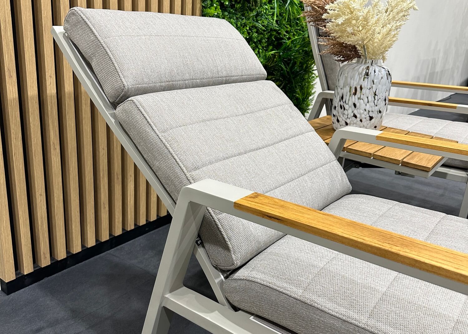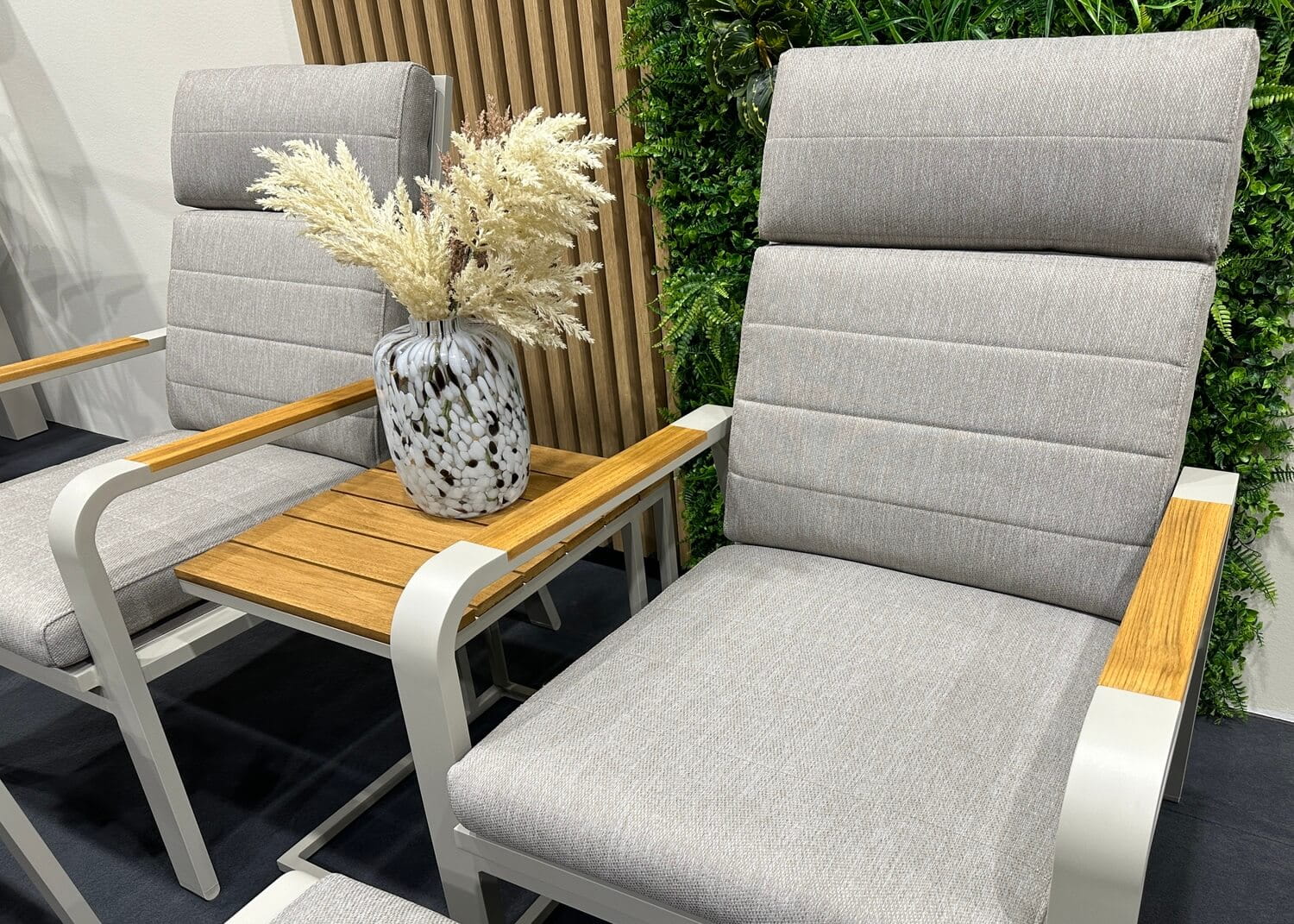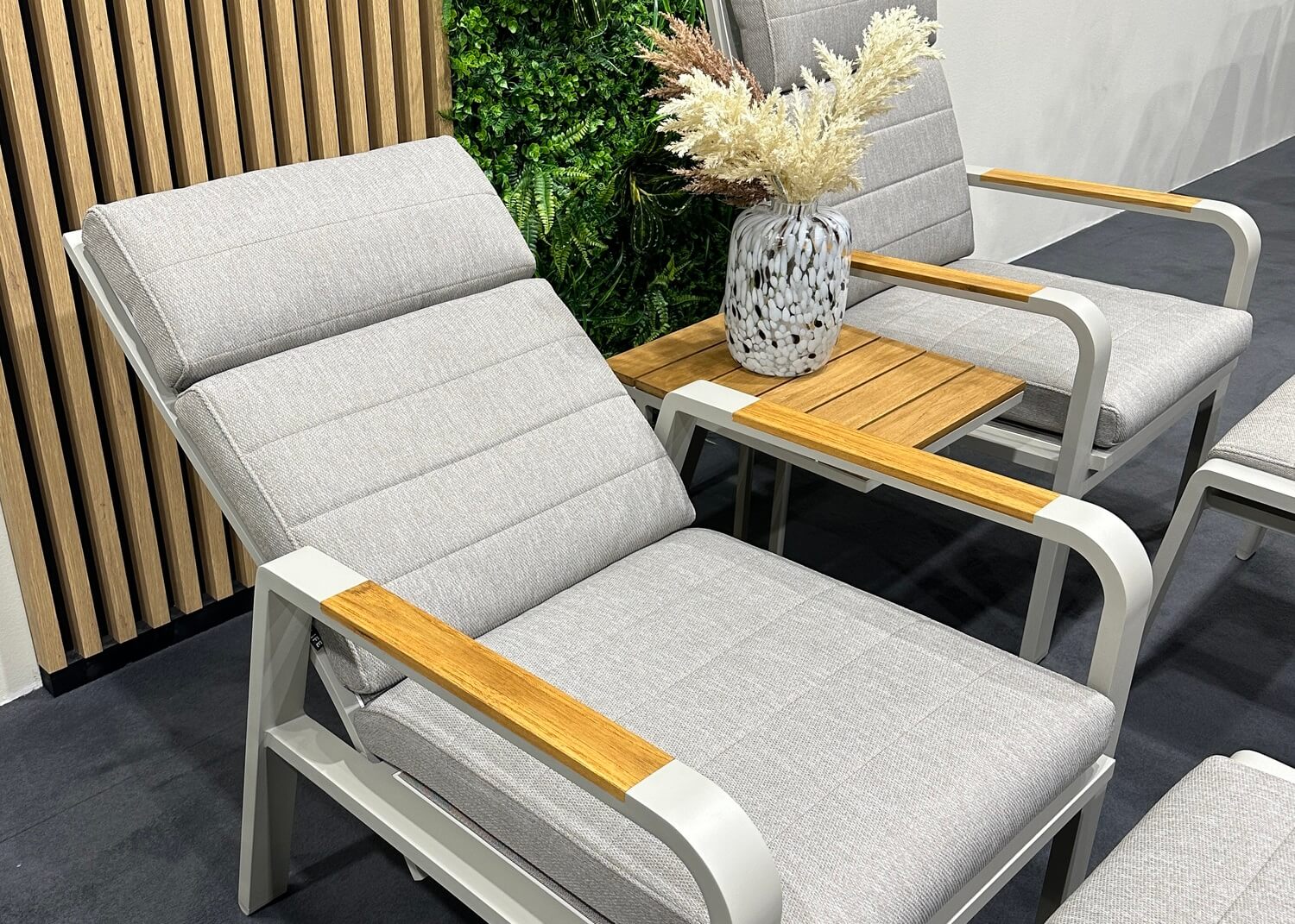 Zestaw Montana doskonale podkreśla harmonię komfortu i stylu w ogrodowej strefie wypoczynkowej. Składa się z dwóch foteli relaksacyjnych z praktycznymi podnóżkami oraz stolika kawowego, który wyróżnia się eleganckim blatem z drewna teakowego. Całość konstrukcji wykonana jest z malowanego proszkowo aluminium, co nie tylko nadaje jej nowoczesny charakter, ale także zapewnia trwałość i odporność na warunki atmosferyczne.