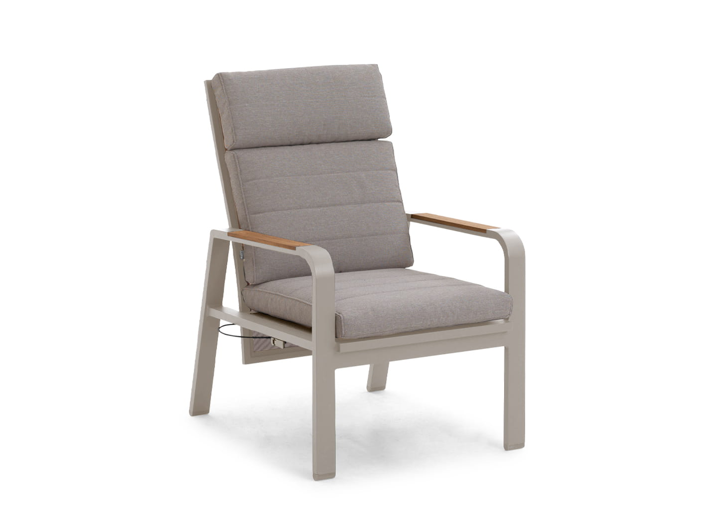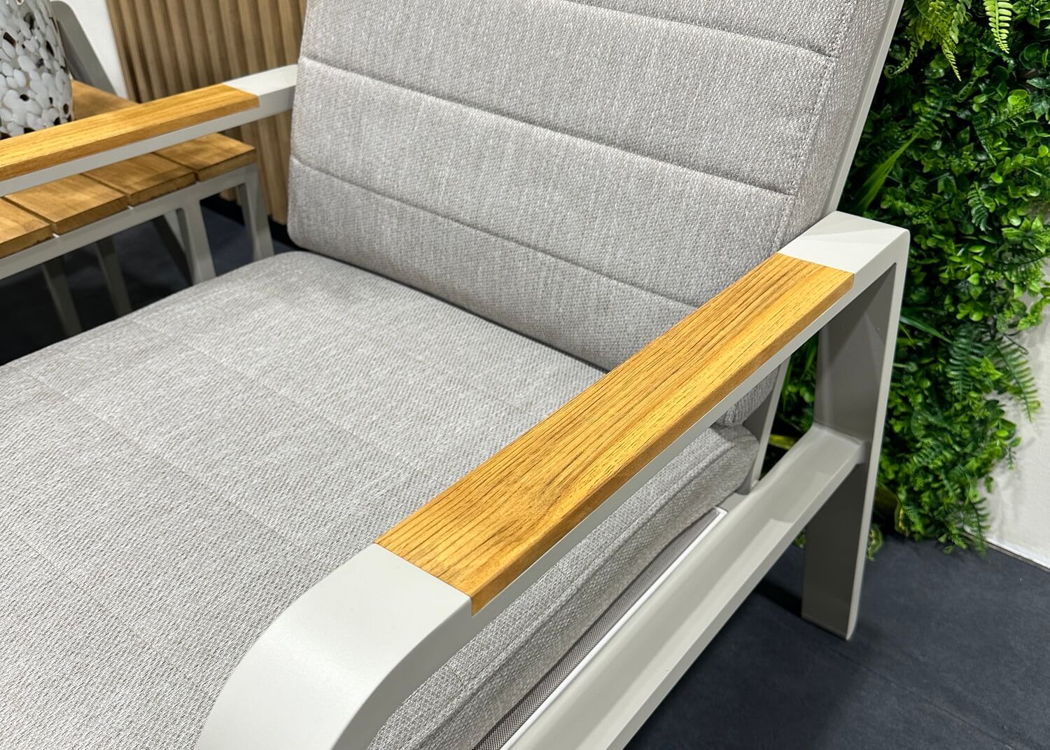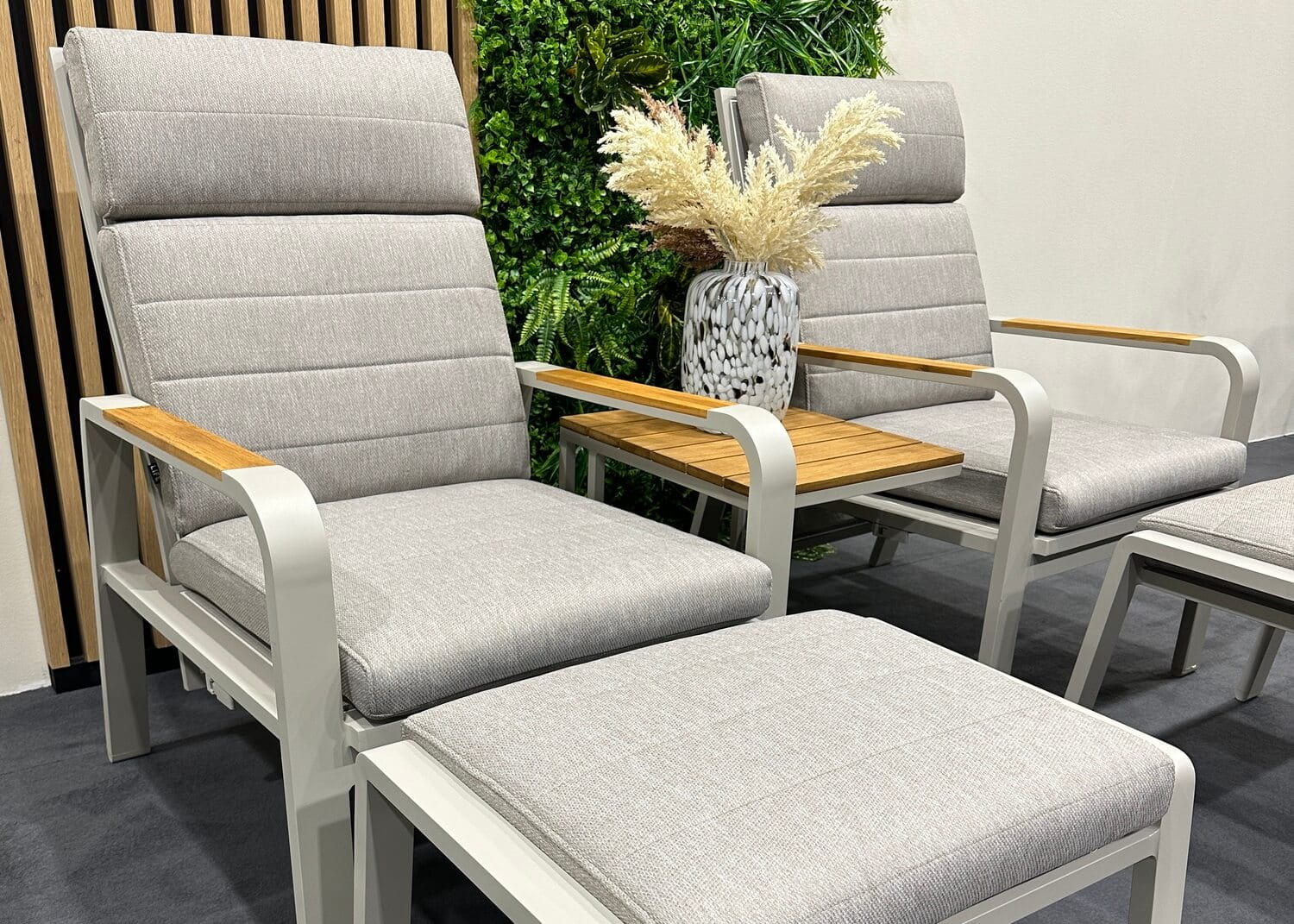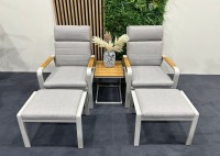 Zestaw Montana doskonale podkreśla harmonię komfortu i stylu w ogrodowej strefie wypoczynkowej. Składa się z dwóch foteli relaksacyjnych z praktycznymi podnóżkami oraz stolika kawowego, który wyróżnia się eleganckim blatem z drewna teakowego. Całość konstrukcji wykonana jest z malowanego proszkowo aluminium, co nie tylko nadaje jej nowoczesny charakter, ale także zapewnia trwałość i odporność na warunki atmosferyczne.