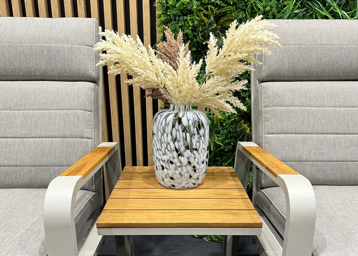 Stolik kawowy z blatem z drewna teakowego dodaje zestawowi niepowtarzalnej elegancji i naturalnego uroku. Drewno teakowe, odporne na warunki atmosferyczne, sprawia, że stolik zachowa swój estetyczny wygląd przez wiele sezonów.