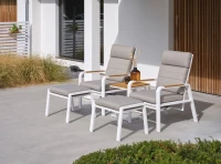 Zestaw Montana to znakomity wybór dla miłośników komfortu i stylu w ogrodowej przestrzeni wypoczynkowej. Składa się z dwóch foteli wypoczynkowych z podnóżkami oraz stolika kawowego z eleganckim blatem z drewna teakowego. Cały zestaw jest wykonany z malowanego proszkowo aluminium, co nie tylko dodaje mu nowoczesnego wyglądu, ale także gwarantuje trwałość i odporność na warunki atmosferyczne.