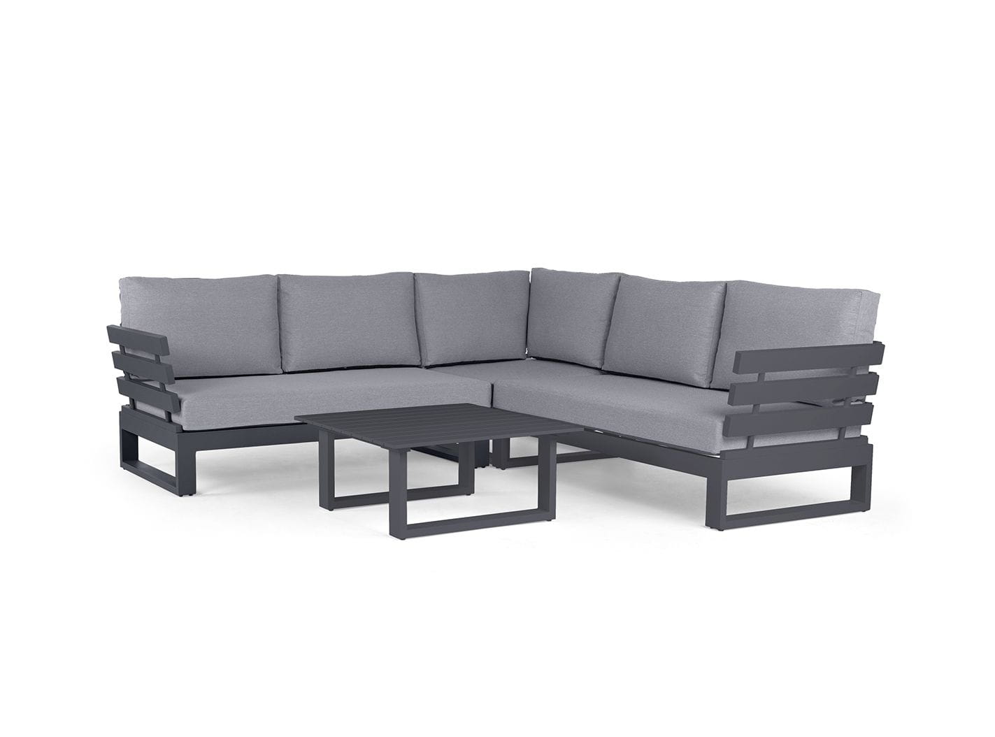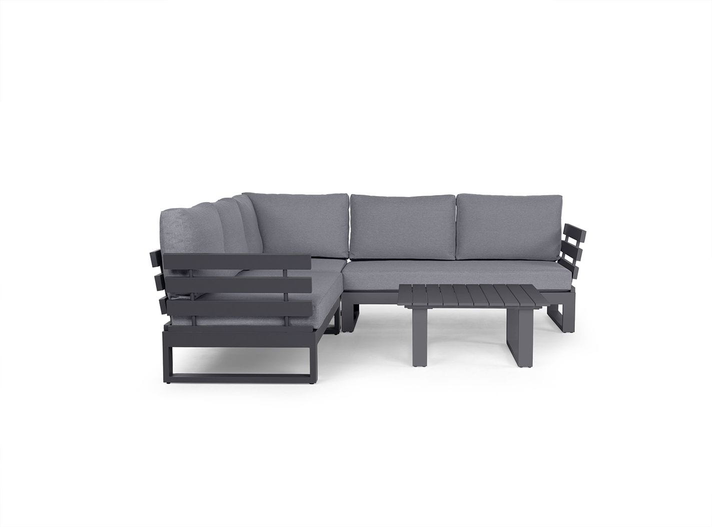 W skład zestawu wchodzi również kwadratowy stolik kawowy wykonany z aluminium. Ten lekki, ale wytrzymały stolik doskonale uzupełnia cały zestaw, tworząc funkcjonalne miejsce do postawienia napojów, przekąsek czy dekoracji.