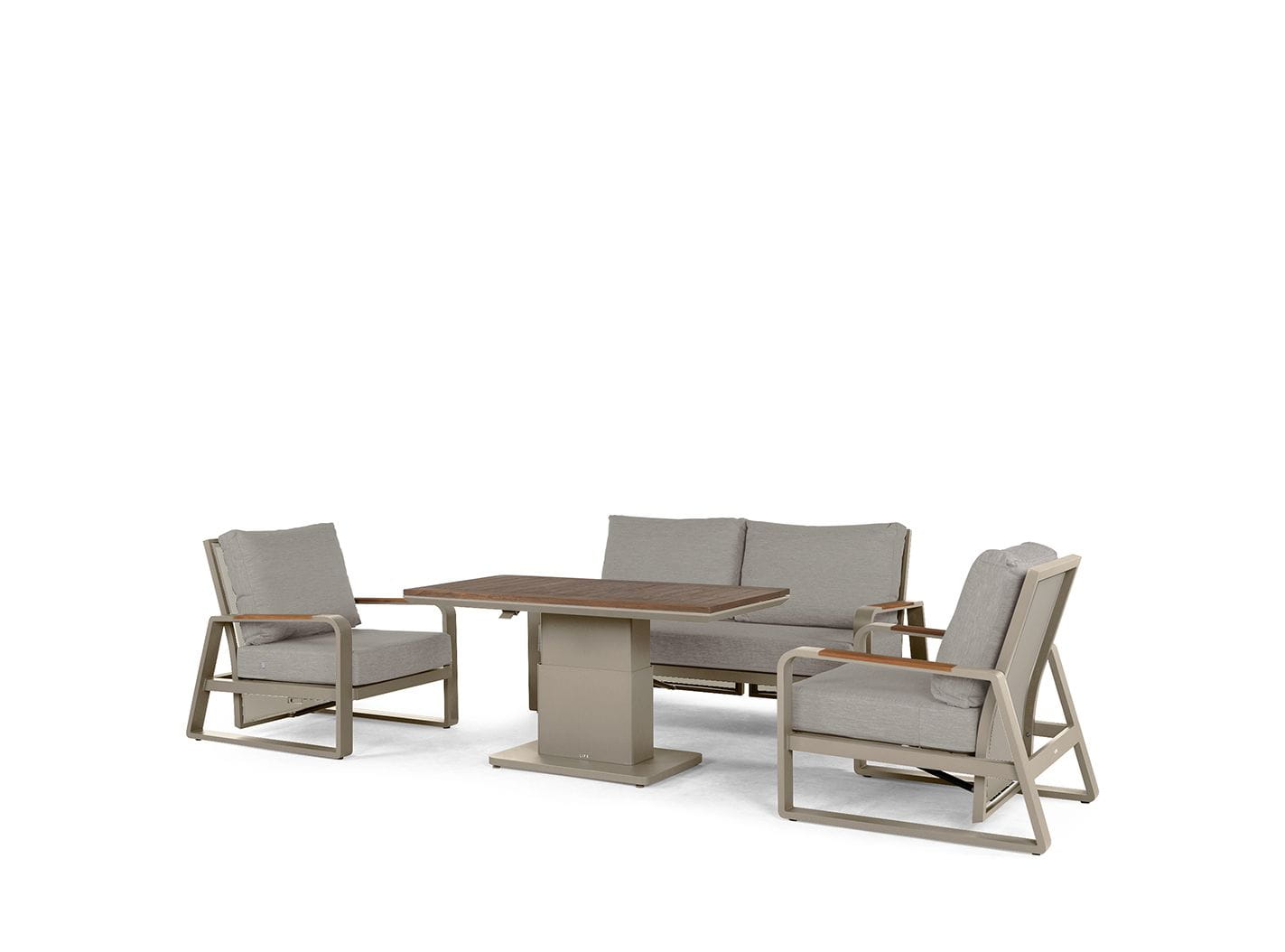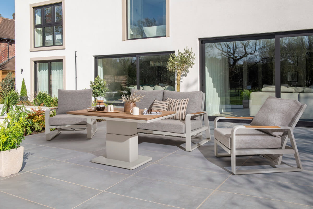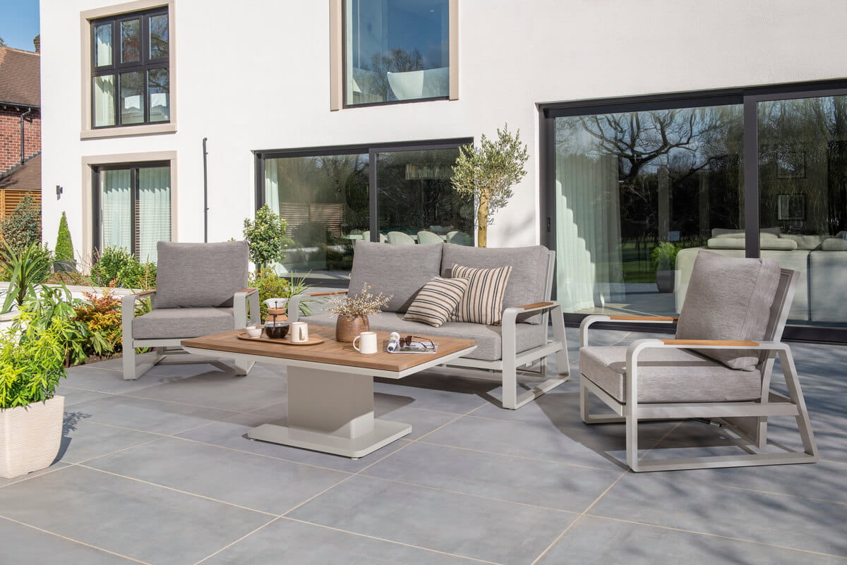 Zestaw składa się z dwóch foteli oraz sofy, z regulowanym oparciem, co pozwala na dostosowanie kąta nachylenia do indywidualnych preferencji i zapewnia maksymalny komfort podczas wypoczynku na świeżym powietrzu.