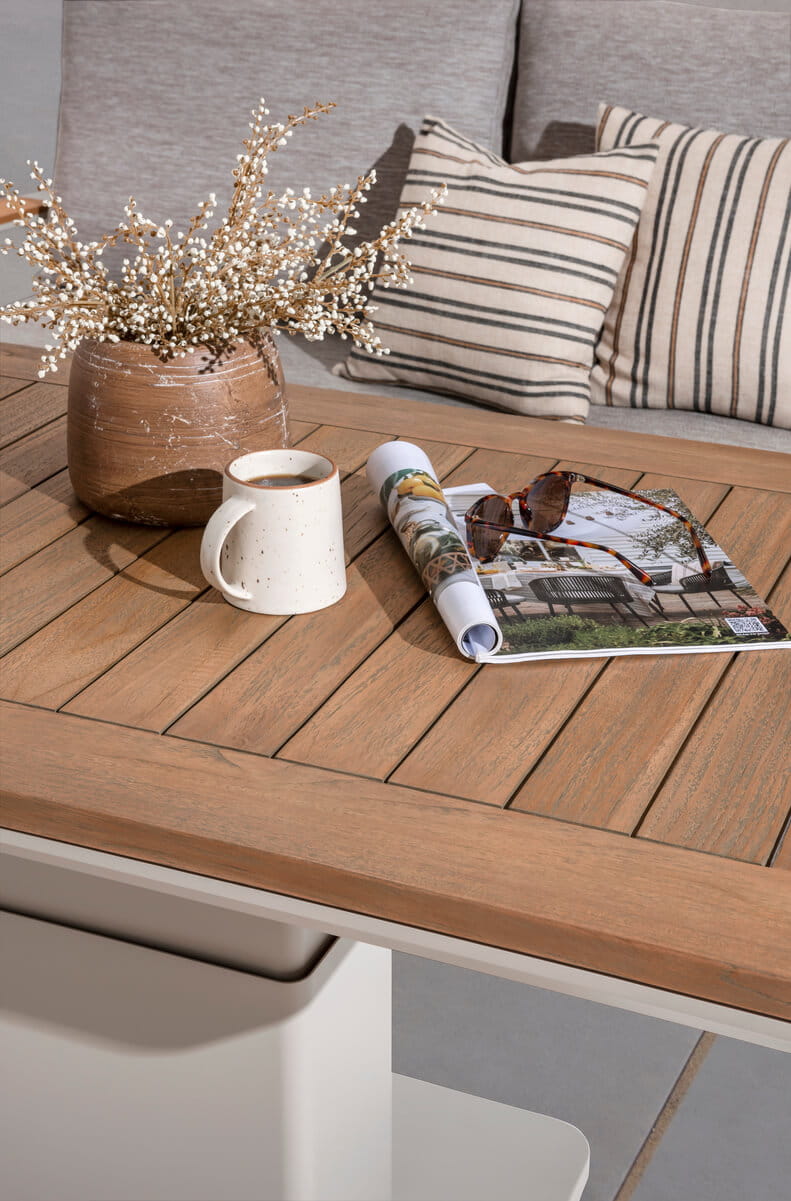 - Drewno tekowe - charakteryzuje się zdolnością do absorbowania ciepła, co sprawia, że mebel jest przyjemny w dotyku nawet w gorące dni. Jest także naturalnie bardzo odporne na gnicie i grzyby, co zapewnia długotrwałą trwałość mebla nawet w trudnych warunkach atmosferycznych. Dodatkowo, drewno posiada certyfikację, potwierdzając jego legalność i zrównoważone pochodzenie.