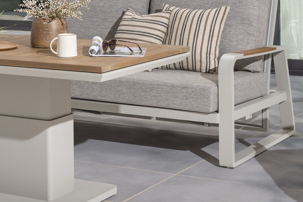 W komplecie znajduje się także stolik wykonany z drewna teakowego. Teak jest cenionym materiałem w meblarstwie ogrodowym ze względu na swoją trwałość i naturalną odporność na wilgoć oraz działanie czynników atmosferycznych. Stolik ma możliwość regulacji wysokości od 48cm do 74cm, dzięki czemu można go łatwo dostosować do różnych sytuacji, takich jak spożywanie posiłków, picie kawy czy praca na laptopie na świeżym powietrzu.