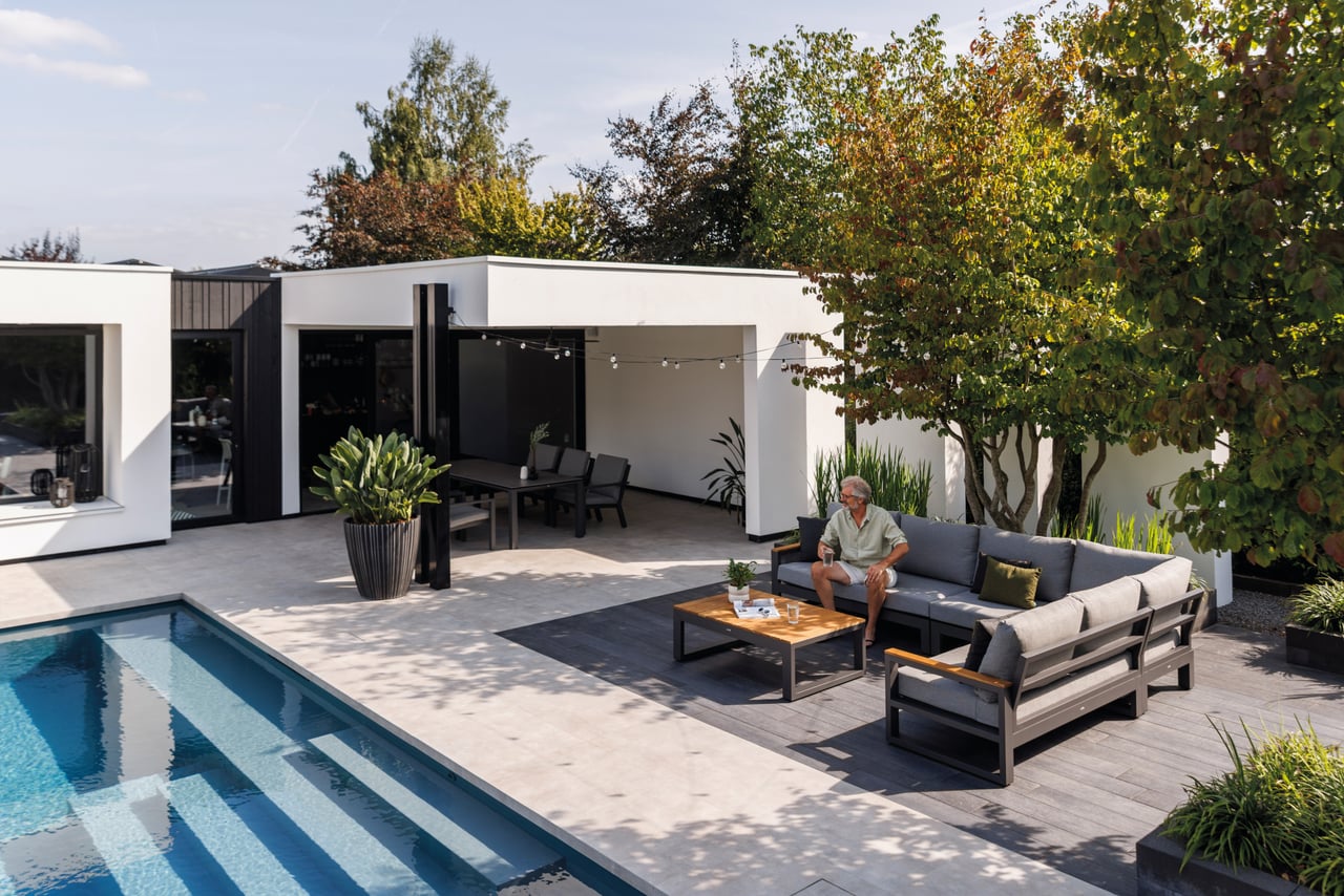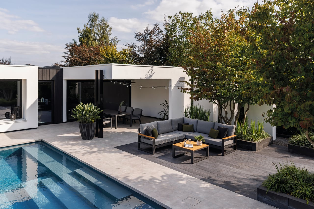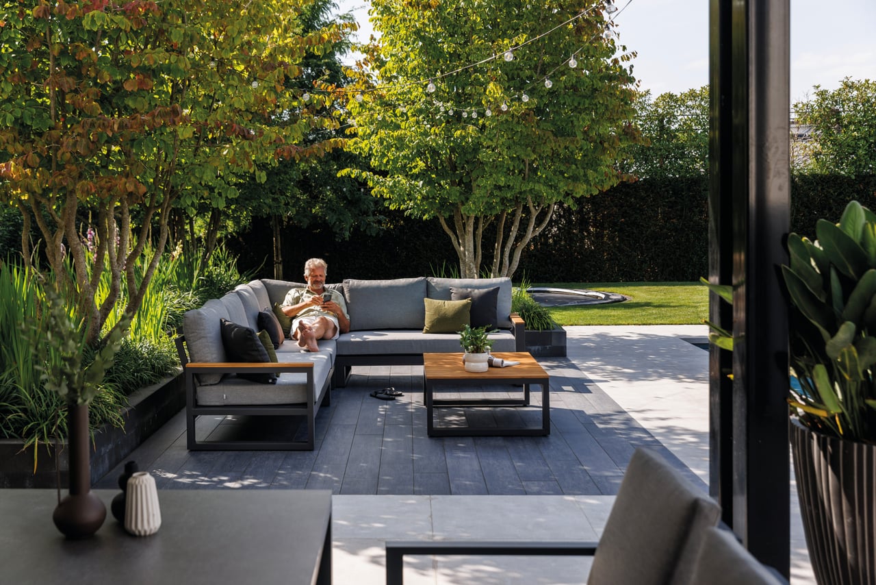 Duży zestaw wypoczynkowy Soho 5 seat Lava Mist Grey zapewnia 5 miejsc siedzących. Doskonale sprawdzi się w kąciku kawowym na tarasie albo w przestrzeni do wypoczynku w ogrodzie. Meble tworzące zestaw mają konstrukcję z aluminium w kolorze grafitowym. Surowość prostych form sprzętów równoważą grube poduszki mist grey Soltex. Akcesoria zwiększają komfort użytkowania narożnika i dodają całej aranżacji więcej przytulności. Kolorystykę zestawu urozmaicają elementy wykonane z drewna teakowego – podłokietniki oraz blat stolika kawowego.
