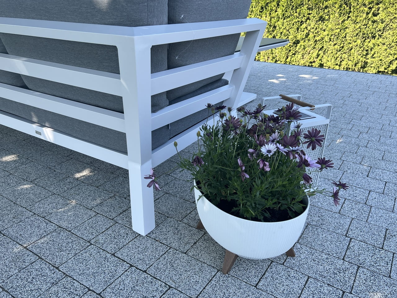 Modułowy zestaw narożnikowy z kolekcji Timber z podłokietnikami to nowoczesna propozycja do ogrodu i na taras. Został wykonany z trwałych profili aluminiowych pomalowanych proszkowo na biało. Dzięki doborowi tego szczególnego materiału oferowane meble są wytrzymałe i odporne na zmieniające się warunki pogodowe. Ponadto proponowane sprzęty łatwo utrzymać w czystości, a ich konserwacja nie przysparza problemów. To idealne meble do ogrodu, gdy szukasz wygodnych i praktycznych elementów wyposażenia swojej własnej strefy relaksu na świeżym powietrzu.